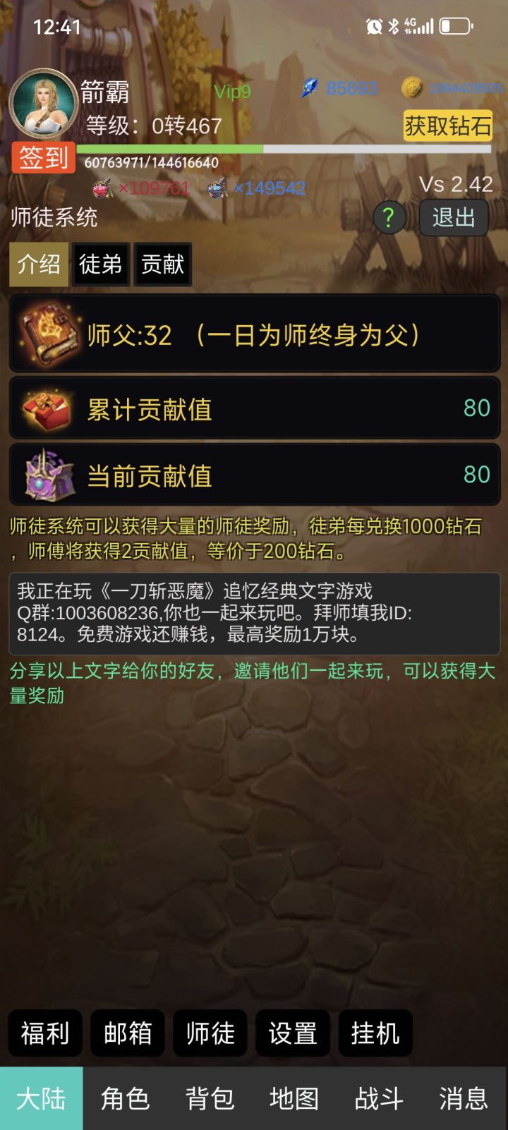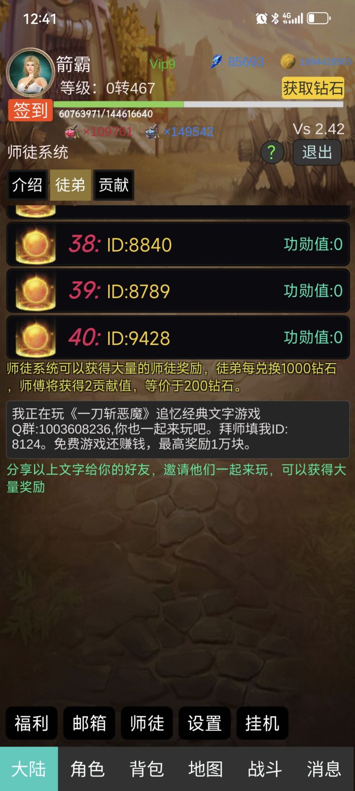资深师傅 8124!拜完师群里呼叫送400Z起步 开V9送2000Z 之后充值反百分之15钻石!一、氪佬玩法 V9、月卡必备!如果你想称霸服务器的话,那个400R的经验卡礼包,可以找群主买个5个,你会获得200000钻石和5张经验卡,把经验卡全部用完,你的经验倍率应该是4.5倍,吃一个经验卷,相当于普通玩法的2.5被左右。二、打怪挂机、点击地图前往 “神魔大陆” 打怪。打怪时,若发现打怪速度过