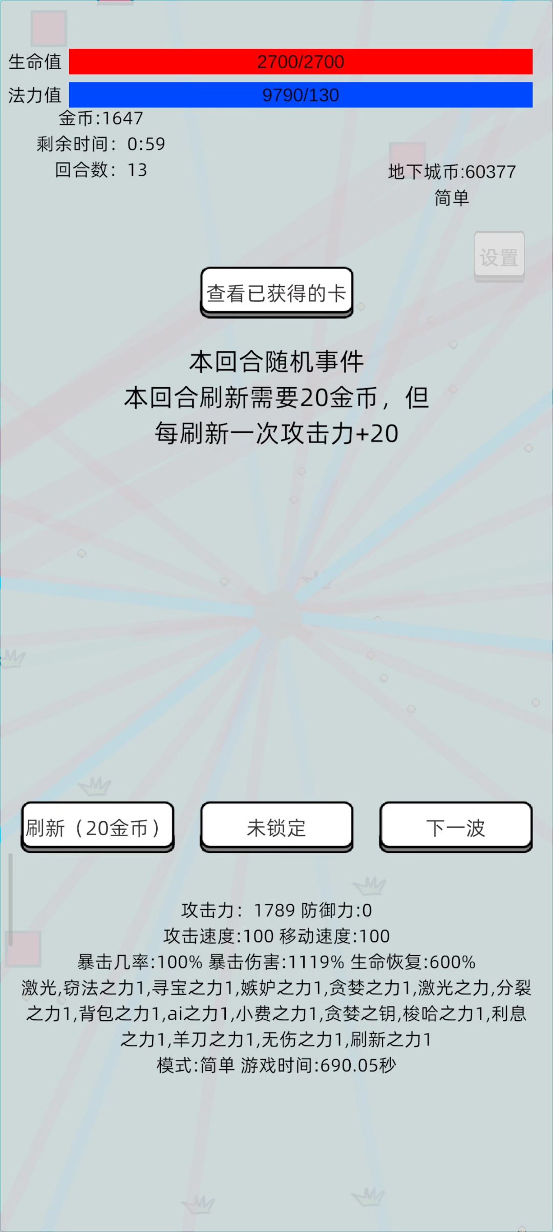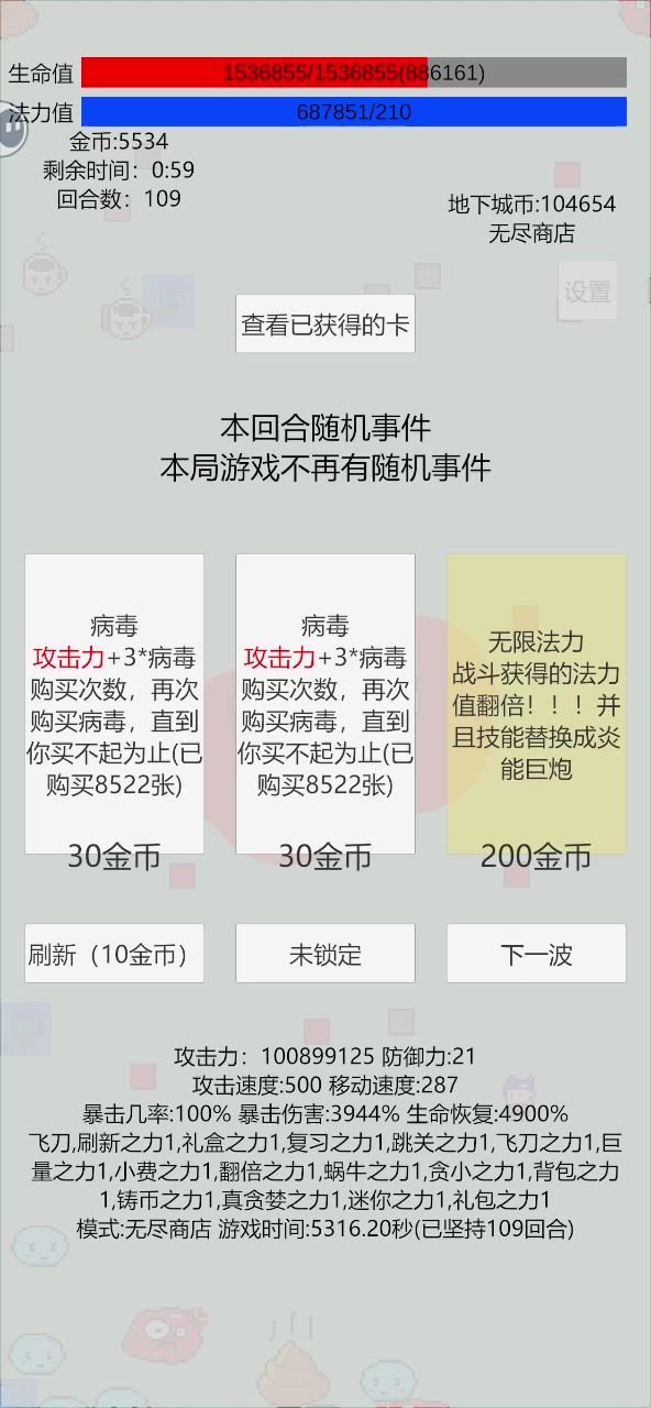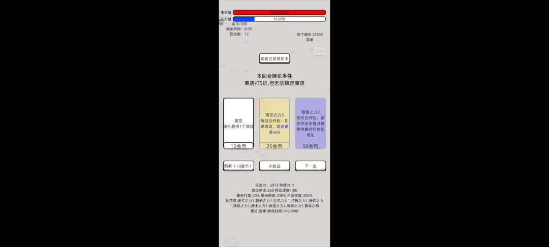 使用武器:飞刀 卡牌:愤怒之钥 飞刀之力 数量之力 巨量之力 弹速之力 平凡之力 色欲之力 圣盾之力 病毒之力 分裂之力 打法:第一轮拿飞刀之力,第二轮拿数量之力,前期一直线走,注意躲避,然后就开始刷钱,把圣盾、病毒之外的卡牌都买了,无生存压力加数量的优先,有生存压力先买色欲和分裂。分裂之力越晚买越好,打怪太快的话飞刀刷不出来,最好13轮结束再买。14轮结束狂买圣盾和病毒,抗几下就能打死愤怒之神了