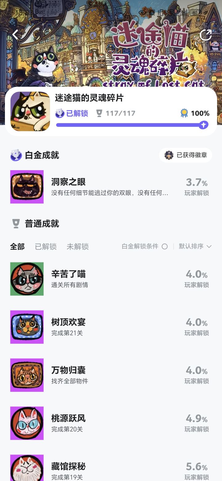 6.6买的迷途猫两部作品,断断续续玩了10个小时通关全部内容,全成就如p1所示😎