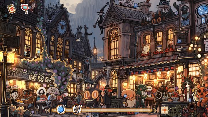 游戏共有十个关卡,每个关卡有主线搜集猫猫灵魂,和三个支线任务,发布支线任务的NPC会有高光显示。游戏整体上不算难,要找的物品还会给你下一张图案样貌的提示,这个功能虽然在前期没什么用,但是在每种物品就剩最后两三个的时候是非常有用的。大部分的图案都很容易辨析,但是每一关总是会有那么两三个会隐藏在暗处,掩盖掉正常的光影,也就和同案提示的颜色有一点区别,这种拥有保护色的物品就会非常难找,有时候会耗时好久。