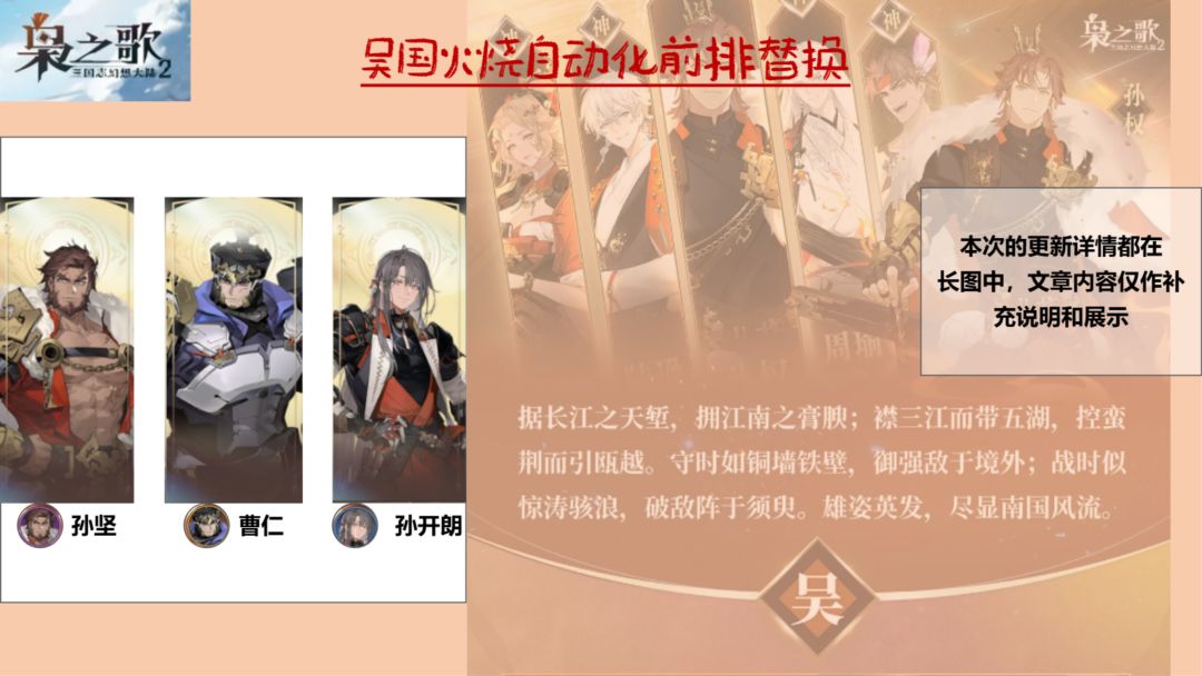 #三幻2枭之歌创作征集令 欢迎各位的催更啊,小铃这次带来的是大家催更俩天的火烧前排曹仁,孙坚,孙开朗的自动化替换[表情_开心] 曹仁作为可以让火烧整体坦度上升一个维度的存在,相比甘宁火烧会更加持久上限更高。 曹仁火烧的站位需23靠左俩列分布,确保步练师在左下角就可以。 孙坚火烧作为4⭐的过渡前排,在敌方没有高爆发秒掉孙坚的情况下,可以依靠“威慑”来频繁回血达到提高坦度的效果。 孙开朗火烧属于奇招