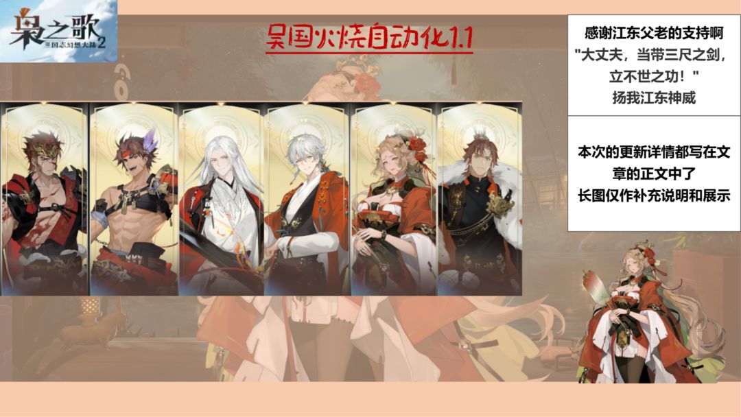 #三幻2枭之歌创作征集令 孩子们,经过一天的紧赶慢赶1.1的火烧自动化设置也是端了上来,经过实战测试,在战力差距不大的情况下面对群越有一战之力,打之前的1.0火烧更是拿捏[表情_看我的],我们看看优化了哪些吧 更新日志: [表情_+1]1.调整了甘宁的技能释放逻辑,甘宁的技能释放更为频繁,打断的优先级大大提升,不会出现像1.0的战意值浪费的情况. [表情_+1]2.为甘宁,周泰,陆逊,步练师,孙权