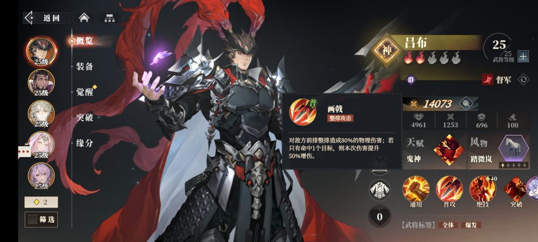 首先是吕布的好搭档袁术 相邻的队友使用大招后会获得护盾 以及一层簇拥 袁术获得三层簇拥后大招可以减免30战意消耗 只需要10战意就可以给一个队友提供护盾及30%增伤 其次是袁术的觉醒分支 将军 每次袁术普攻会邀请战力最高的队友进行一次普攻 并且提升30%普攻伤害 吕布的数据给的是很高的 完全体自带30%增伤 30%暴率 30%爆伤 而且 普攻整排 对单体还有额外50%增伤 大招会额外追击一次普
