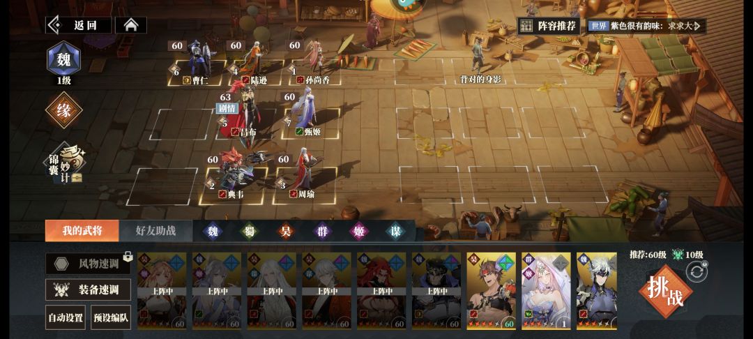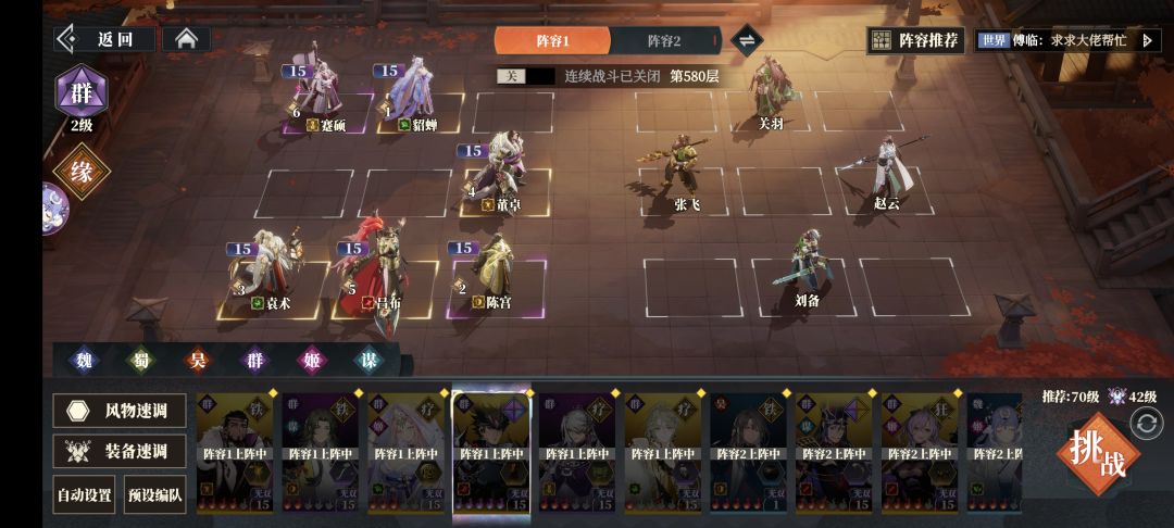 #三国志幻想大陆2枭之歌 目前我自己的pk配对,现在核心就是张飞和诸葛亮,纯谋士队太脆玩不了,我目前就是第一回合赵云关羽全蓄力战意,张飞开突破技然后开大,郭嘉开技能,诸葛亮开突破技,竞技场需要在自动里面设置。 目前不是大跨战力基本稳赢,昨天8w战力时候可以越满红吕布12w战力竞技场,虽然多半是对面没设置自动释放顺序