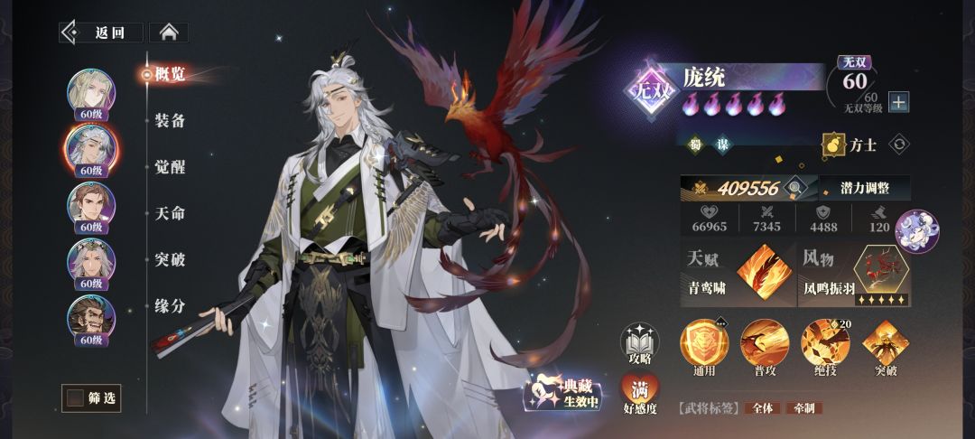 这个角色咋说呢,目前来说强绑诸葛亮 然后就是他的核心机制凤羽,涅槃,铁索连环 凤羽没到5火前这玩意很废物,5火后触发他的核心涅槃后才厉害,因为你每次平a也好技能获得的也好立马使用不会被驱散成为一个最恶心的肉,目前来说竞技场也就王异打的过带庞统的阵容,火烧都不行了 然后就是他的另外一个核心了铁锁连环专门克制蹇硕和岳池,但是实际测下来这个效果并不明显,吕布还是可以二大的,然后就是他这个只要对面有一