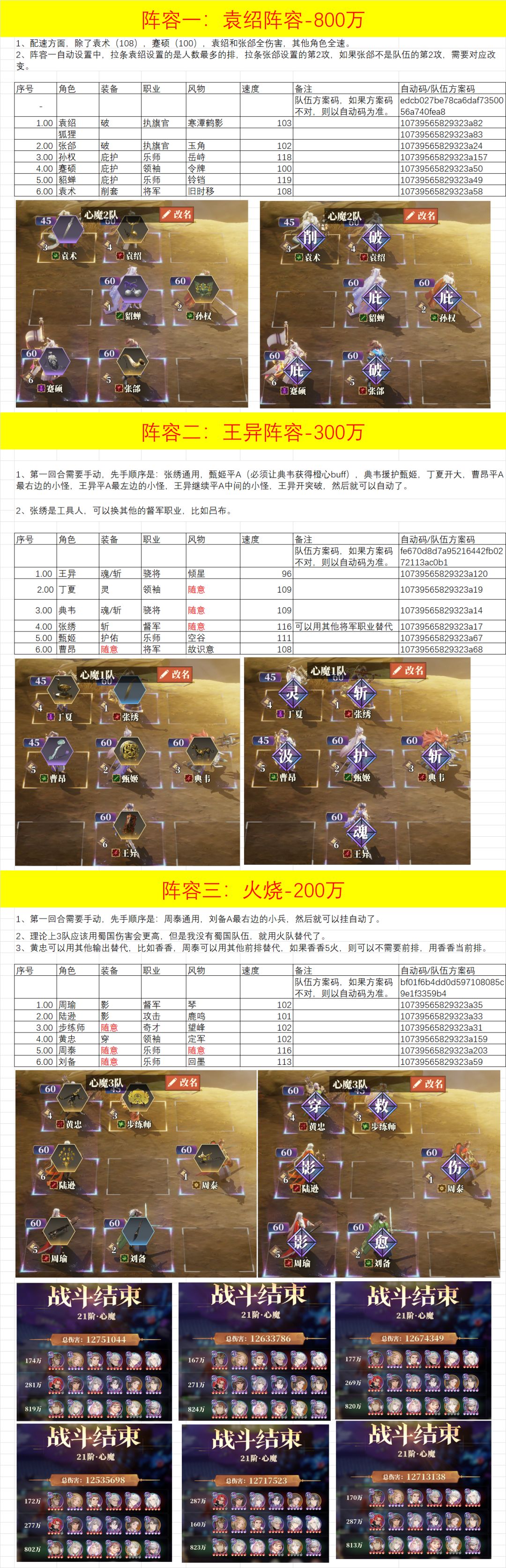 工会boss目前21阶,需要三队,于8月27日进行更新,时间紧迫,可能并不是最完美的阵容。后续会不定期优化。 阵容一:以袁绍为主,800万左右。 阵容二:以王异为主,300万左右。 阵容三:以火队为主,200万左右 1、阵容一:自动设置中,拉条袁绍设置的是人数最多的排,拉条张郃设置的第2攻,如果张郃不是队伍的第2攻,需要对应改变。 2、阵容二:第一回合需要手动,先手顺序是:张绣通用,甄姬平A(必须