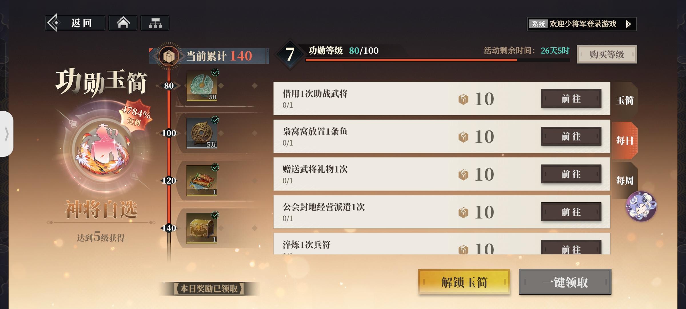 各位少将军:全新版本「万象破晓」将于1月16日 05:05正式上线!破晓主题服专属活动同步开启,全新「减负特权卡」首发,自动推关、解放双手,真正“躺赢”!首周充值享「等额返还」,最高返328元!每日签到免费领「人气神将」孙策司马懿二选一,送包含「貂蝉·花簇满团」皮肤、主城插画「桃园少女团」在内的海量好礼!第5天解锁【幻谷】,开服「14日活动」焕新升级,全新体验等你探索! 一、主题服全新主