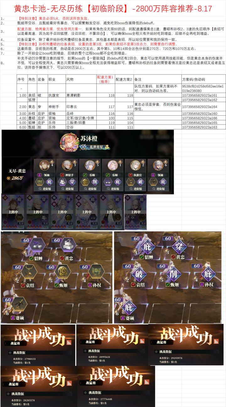 *** 【再遇阶段】没有新增的变数,推荐的阵容依然可以适用,目前推荐的阵容,自动打了3100万,多挂几次吧,稳定3000万左右。***补充一个极限凹分的阵容,见评论区。*** 1、【特别注意】黄忠必须5火,否则该阵容失效。2、甄姬带空谷,且甄姬最好有暴击,可以频繁触发空谷,避免吃到boss伤害降低的debuff。3、配速方面,给两套方案,优先使用方案一,如果有角色没无双60的话,则配速遵循