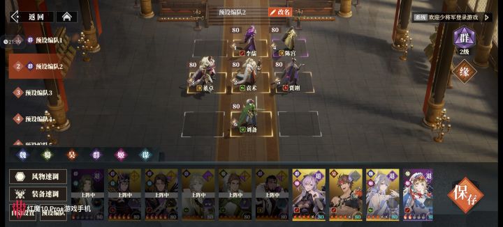 今天第三天了,还是没出孙权,阵容构筑暂时就像上图。pvp可上蔡文姬换掉刘备或者袁术,目前游戏净化很是稀缺,应对火、毒蔡文姬都是很好的选择。简单介绍一下各个武将吧因为没孙权暂时上的陈宫,用着也还行,配合毒队的高频次毒伤有可观的回复能力,pve里前排还算合格,pvp里挂个追随明公(一火解锁的被动,最高攻武将加攻击,免疫伤害,每回合回血)之后查无此人。袁术说实话有点限制站位,被张春华一锁直接伤害吃