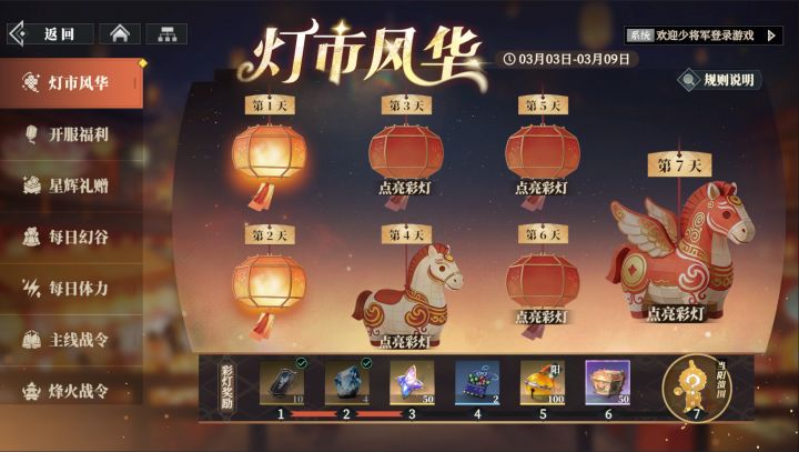 各位少将军:风华流转处,最是灯火温柔!元宵佳节之际,全新签到活动「灯市风华」将于3月3日 05:00温情上线。活动期间,每日登录点亮彩灯,即可领取丰厚好礼,连签七日更有豪礼相赠,邀您共赴一场灯火阑珊的元宵之约! 活动时间:3月3日 05:00--3月10日 04:59开启条件:角色等级大于10级 活动规则:1. 每日登录领奖:活动期间,少将军每日登录游戏后,前往【福利】页面的