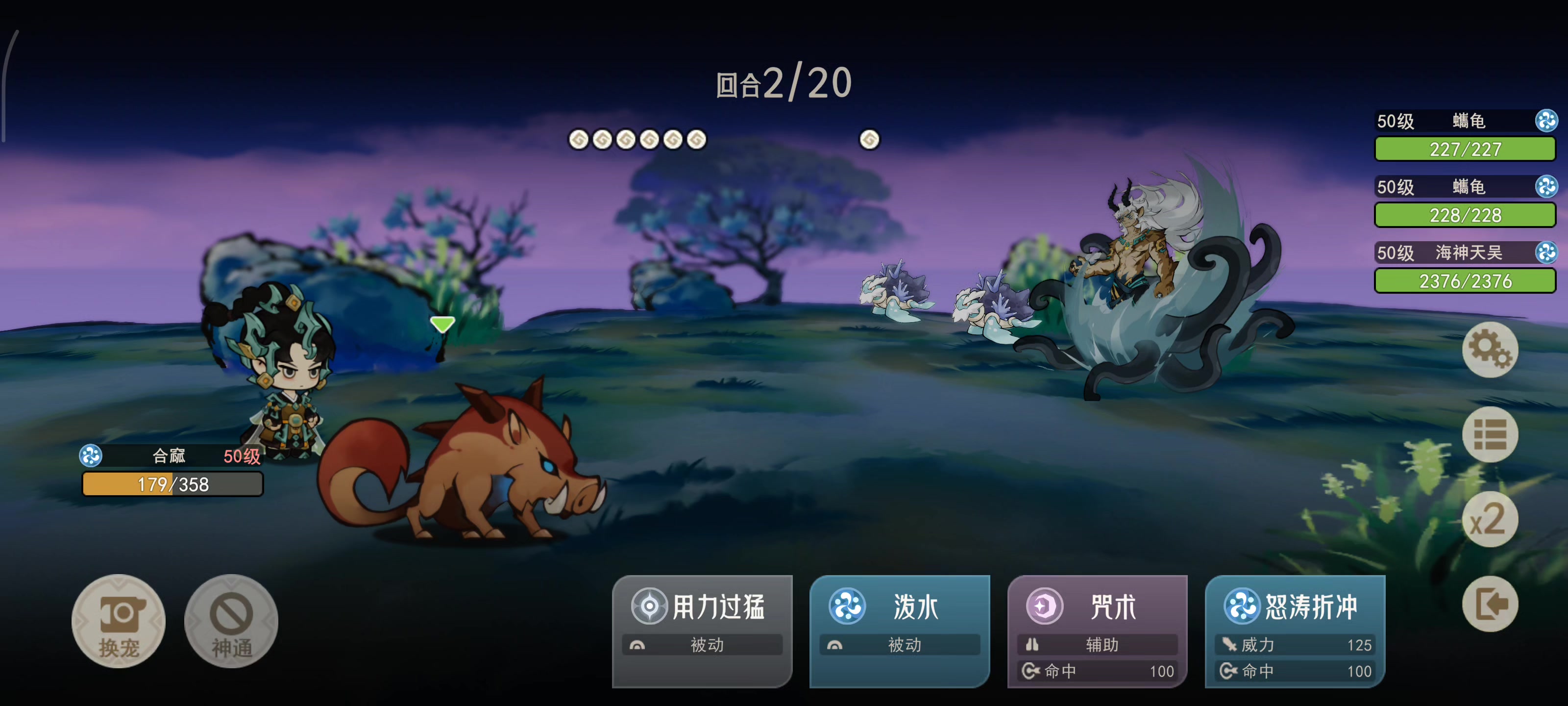 仅提供一点思路,新人不是很懂属性计算,所以有些地方说不出详细的解释。 目前等级67级,宠物70级,必备的一定是水猪(就是千年异兽第一个那个),然后有一只资质属性,血脉拉满的鲲,词条有输出就行,最好不要有减速,而且必须有彩贝商店的回血果实,不然鲲也撑不住多久。 打法是开局给水猪上神通《快躲开》,然后给对面boss挂上咒术,然后就可以被打死了,接着换鲲上场,用竞技场那个水属性大招一直打就行,鲲有回血➕