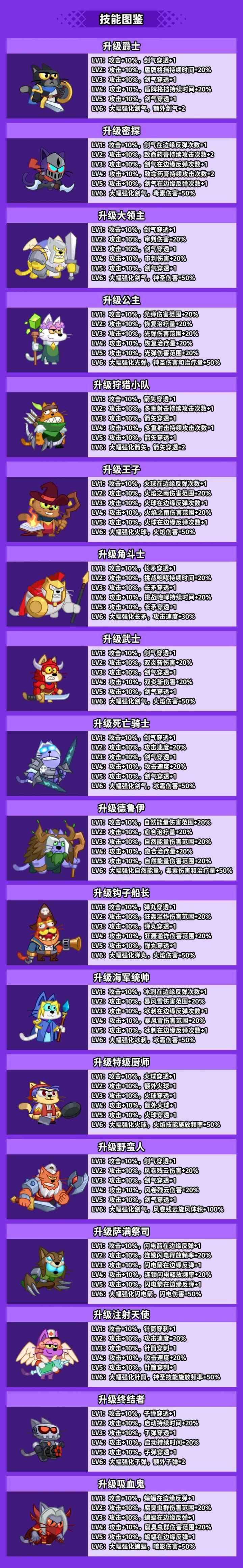 前排提示:本攻略谨代表个人理解,不代表完全是对的,有问题欢迎指正。技能图鉴 所有的技能都有6个等级。 升级角色的选项,等级越高,角色的攻击越高,攻击的弹幕也会变多,并且在6级的时候,角色的攻击会得到质变,同时弹幕的外观也会发生变化。(6级角色很强很强,能升尽量升) 加强职业的选项,等级越高,他在对应职业的功能上越强,守卫是增强扛伤能力,医生是增加治疗能力,其他4个职业都是增强其输出能力。