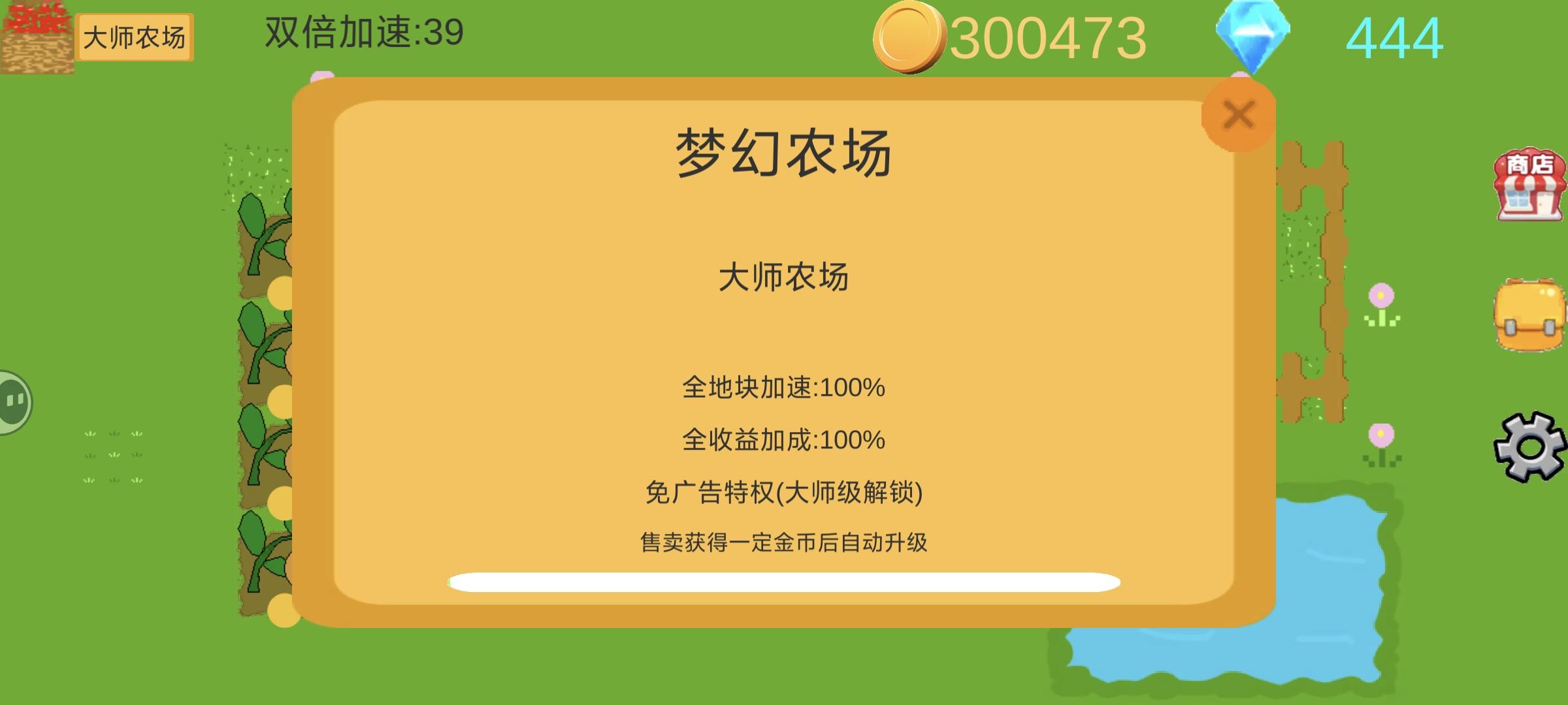 大师级解锁100%加成➕免广告。小鸡上限是6?后面买不动了。鱼塘加成,根据速率从高到低,100/200/300/400只。(这样主界面的加成是整数2000没什么用但强迫症表示很舒服)种子前期一直胡萝卜,后期南瓜。(没算成本利润率,单纯看时间长短)#游戏日常 #闲时农场 #