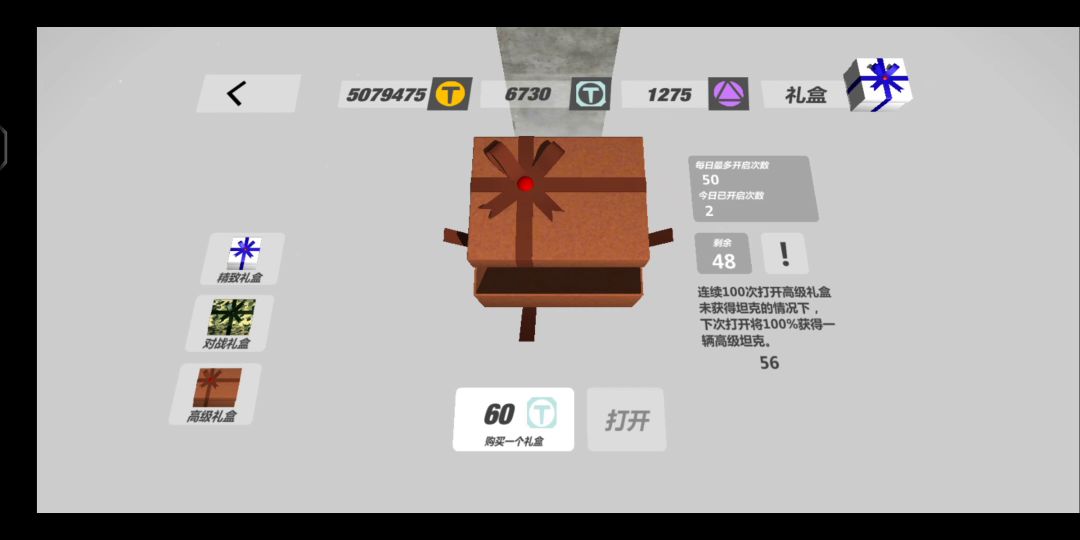 去年也是这个时候左右入坑,不知不觉一年过去了,就说点什么吧 以前很早的时候玩过一代,后来不知怎么的,刷到了二代就下来玩,玩到现在,以下是个人的一些观点,不喜勿喷[表情_微笑] 这一年里,我箱子目前高级礼盒开了41个,愣是没出估计年底才能拿到第一辆礼盒坦。。。按照这个速度算的话,我至少要八年才能拿满所有的礼盒坦………………不过如果作为一款较小的游戏的话,也勉强可以忍受 以下是我对变坦及其优缺点的评价