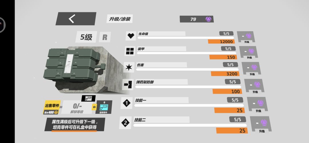 血量:3000(五级满为6000) 伤害:1000(五级满为2000) 装甲:0(五级满为150) 弹药类型:常规弹药 特质被动:免疫来自导弹、榴弹等的冲击力。 技能一:cd:8s 向指定位置发射一枚钩锁(速度很快,类似fz),在钩住障碍物后则会以固定的高速度向钩锁位移,直到位移到钩锁处停下,并在钩锁收回前一直处于钩锁所在位置,如果钩住敌方坦克则会对其造成500点真实伤害(五级满为1000)并向自