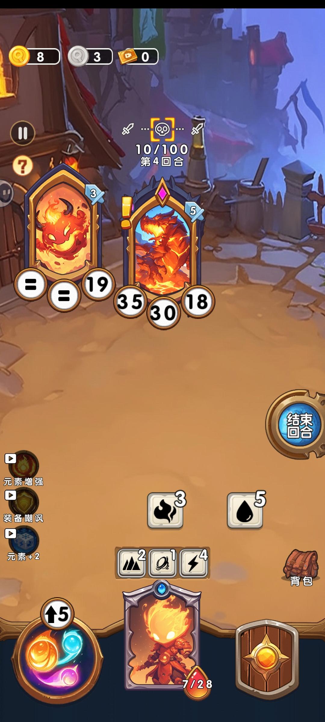 场上元素出现有随机性,有三个可保存元素的格子,以应对不同情况。若元素全部打光只能回合结束进入下一回合,主角会受到敌人攻击。