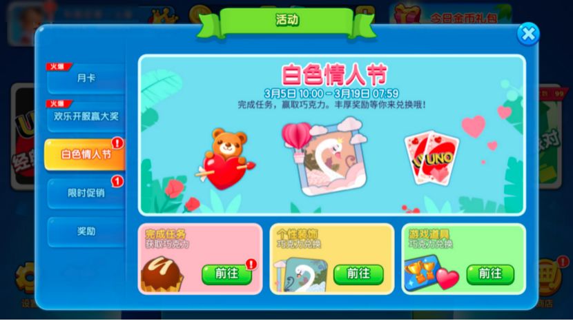 亲爱的小伙伴们: 来《一起优诺》过情人节啦! 有没有发现咱们优诺世界里出现里一颗粉色小心心呢? 没错,正版UNO手游《一起优诺》开启了白色情人节活动! 全新的头像、头像框、卡背等情人节个性装饰,收集巧克力即可兑换!这个白色情人节,《一起优诺》陪你制造甜蜜! 一、 完成每日任务,获得巧克力奖励! 《一起优诺》将在白色情人节活动期间(3月5日-3月17日)每日开启4个任务,完成即可获得巧克力。完成全部