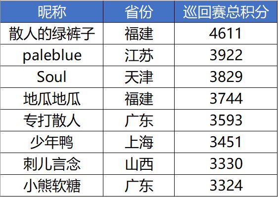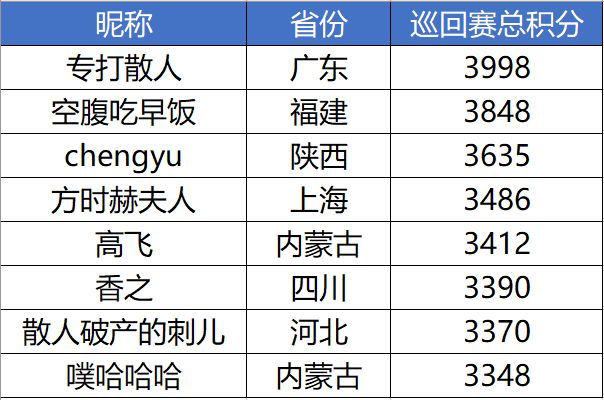 每周一次的仰望大佬环节又来啦~端午节假期刚刚结束,2020UNO中国线上巡回赛“端午杯”周赛就已经落下了帷幕。本周的选手们实力格外强劲,前八名玩家的总分全部突破3000!这也是我们的线上巡回赛开赛以来的首次达成的新成就哦~下面就让我们仔细看看吧! 最先展示的是全国前八名的选手们!继“济南站”周赛夺冠后,福建选手们沉寂了几周时间,终于在本次“端午杯”中大显身手,夺得桂冠。而广东和江苏的玩家们也保持了