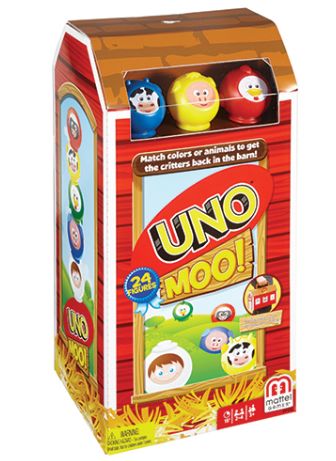 亲爱的小伙伴们:你们知道UNO其实有没有卡牌的版本嘛?看!这也是UNO!这是一副没有卡牌的UNO!这绝对是你从未见过的船新版本!一、世界上最受欢迎的UNO游戏学龄前版本——UNO Moo!UNO Moo!是UNO专门为学龄前儿童设计的版本。它为小朋友们模拟了一个农场——拥有谷仓、干草堆、各种小动物、农民及臭鼬。UNO Moo!简化了UNO的某些特性,用更为简单可爱的动物形象代替了数字,使