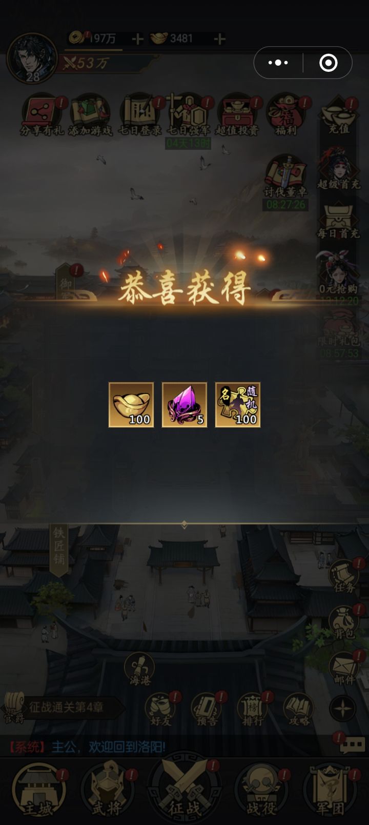 谋略定江山,今群雄并起,各位主公何不加入宫三国干一番大事业!成王败寇在此一举!【活动时间】2024/12/30~2024/1/21【参与规则】玩家预约游戏 截图游戏预约界面界面+个人水印回复本帖参与活动【活动奖励】宫三国游戏周边*5份【活动规则】中奖后需在7天内进入官方Q群(779566467)联系管理员进行中奖登记,中奖后超过7天才登记视为放弃奖励。玩家回帖时必须带有相应截图,