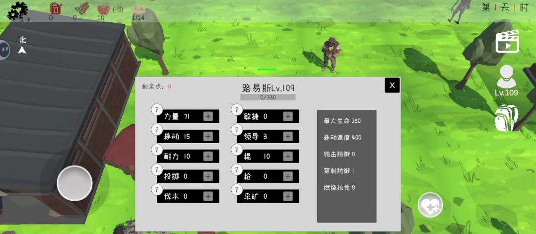三.接着帖子,医疗学家正下方是个笼子,正右方是一个停着摩托的房子,再正右方是个笼子。这两个笼子是固定的,其它笼子位置随机刷新(因为每次重生后部分地块的房子资源随机刷新),木头就靠工人去刷,不过每次死亡重开后都要重新解锁这两个笼子。四.接着我们准备去左3水库,刷等级。右侧人物加点个人建议主加力量,要注意是加力量(攻击力),而不是加棒子(攻速),因为攻击时轮盘小幅移动可以取消攻击后摇,加快攻击速度,砍树也能取消后摇。攻击时候会挥动手中的棒子,在棒子快击中目标时候,拖动轮盘小幅移动。再松开轮盘,人物会继续开始下一次攻击(无后摇)。