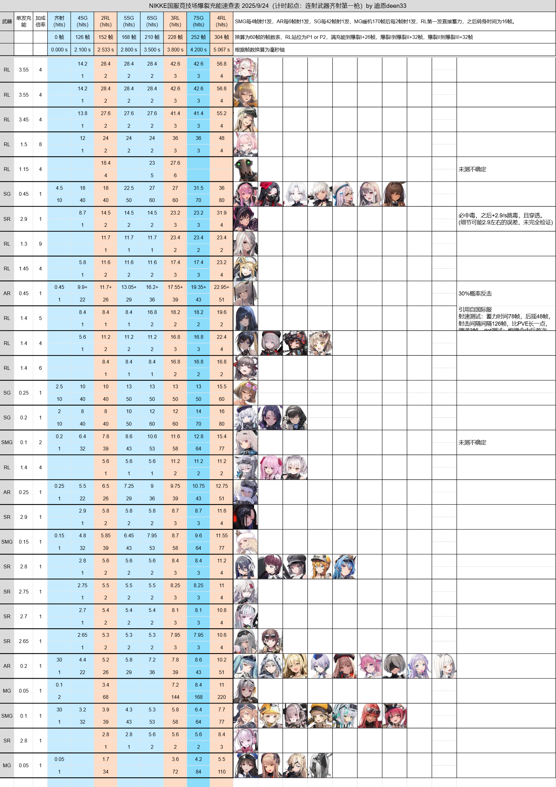 图为妮姬角色充能表,排名越高的充能越快。一般竞技场胜负拼的是谁先开出爆裂大招,基本一轮爆裂就结束比赛,所以配队只需看图里3RL(228帧)或4RL(304帧)同竖列下的5个角色充能数值加起来达到100即可在3发或4发发射器命中后开出大招。 举例3RL配队:诺雅+饼干+爱丽丝+桑迪+诺伊斯 对应3RL充能:36+16.8+5.6+41.4+16.8=116.6 3RL可以看作是以3发发射器的时间为参