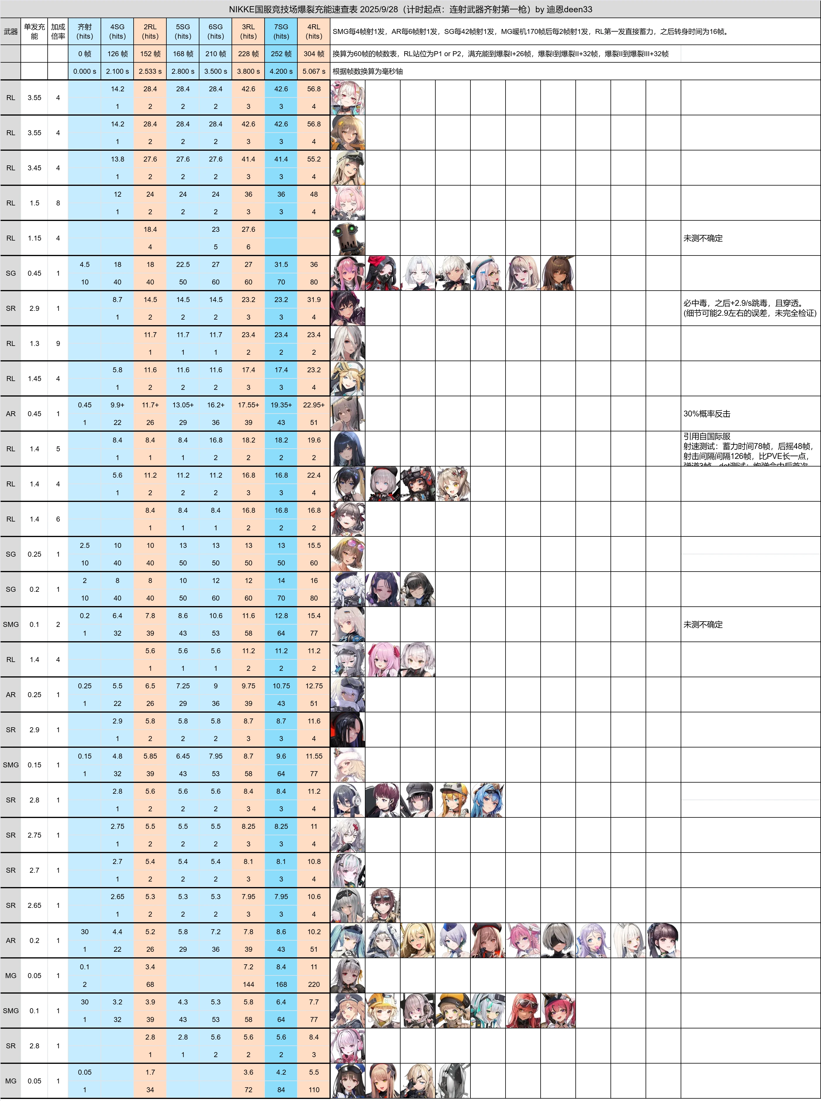 图为妮姬角色充能表,排名越高的充能越快。一般竞技场胜负拼的是谁先开出爆裂大招,基本一轮爆裂就结束比赛,所以配队只需看图里3RL(228帧)或4RL(304帧)同竖列下的5个角色充能数值加起来达到100即可在3发或4发发射器命中后开出大招。 举例3RL配队:诺雅+饼干+爱丽丝+桑迪+诺伊斯 对应3RL充能:36+16.8+5.6+41.4+16.8=116.6 3RL可以看作是以3发发射器的时间为参