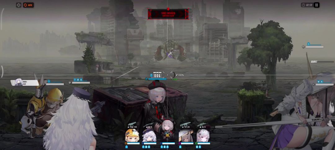 首先,打开游戏帧率调成30帧(暂停清导弹要用到,楼主60帧清不过来,眼花缭乱,但30帧随便清),开局几秒后boss会锁敌跳跃攻击3号,注意切防御,跳完开始输出boss,这时挑一边导弹系统集火攻击,爆裂技能有就开,甚至可以自动技能,多打点输出,当boss两边导弹系统开始放红光的时候,重复esc暂停取消暂停的流程,就注意两边导弹,第一时间移过去处理,Boss双拳放红光时,集火打清掉,后面就是boss会