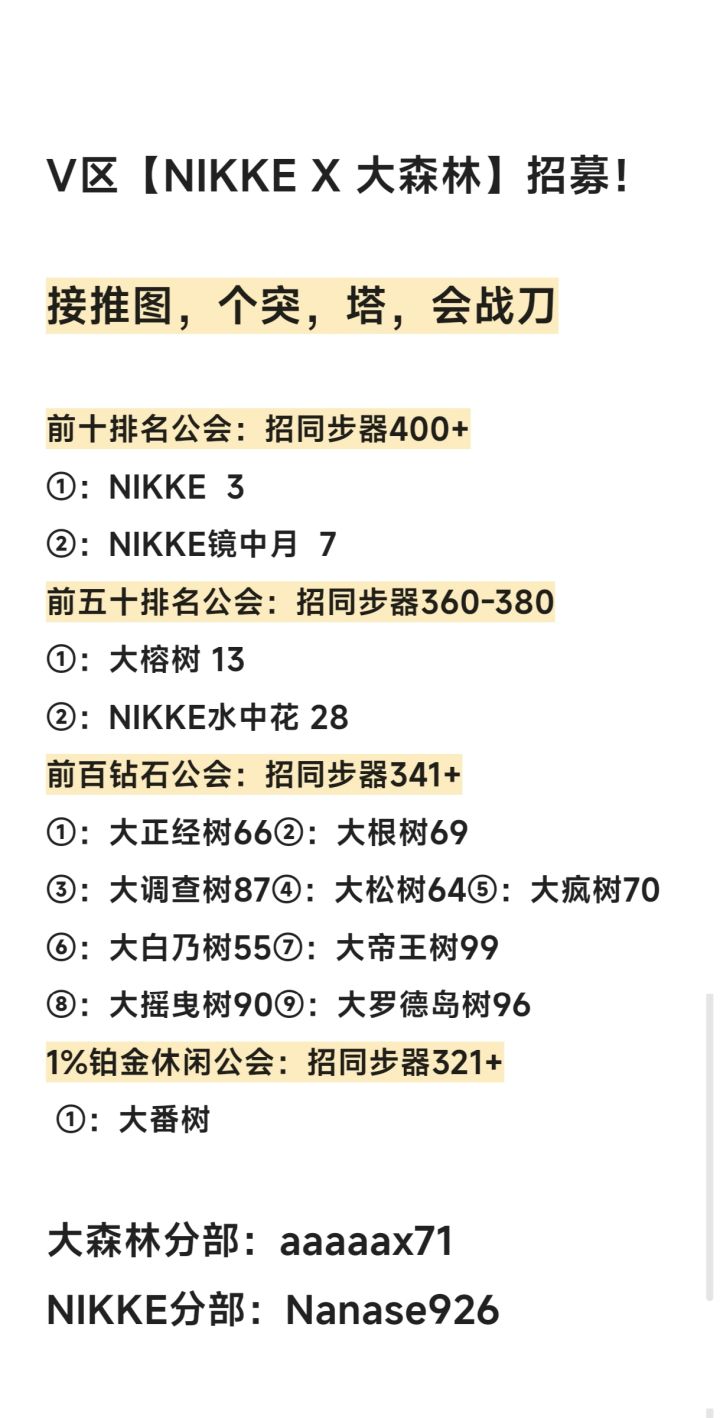 V区《NIKKE X 大森林》,15家公会新赛季招新,欢迎各位小伙伴们滴滴我哦,轻松不卷,快乐游戏
