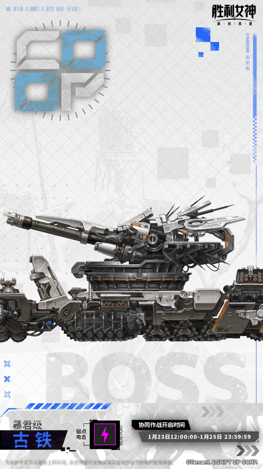 本次协同作战的敌人是【古铁】。 ✦ 协同作战将在以下时间进行:2026/1/23 12:00:00~2026/1/25 23:59:59在大厅 - 活动 - 协同作战中加入战斗吧!#胜利女神新的希望 #nikke
