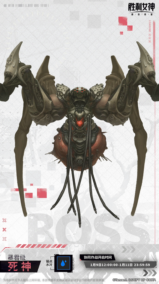本次协同作战的敌人是【死神】。 ✦ 协同作战将在以下时间进行:2026/1/9 12:00:00~2026/1/11 23:59:59在大厅 - 活动 - 协同作战中加入战斗吧!#胜利女神新的希望 #nikke