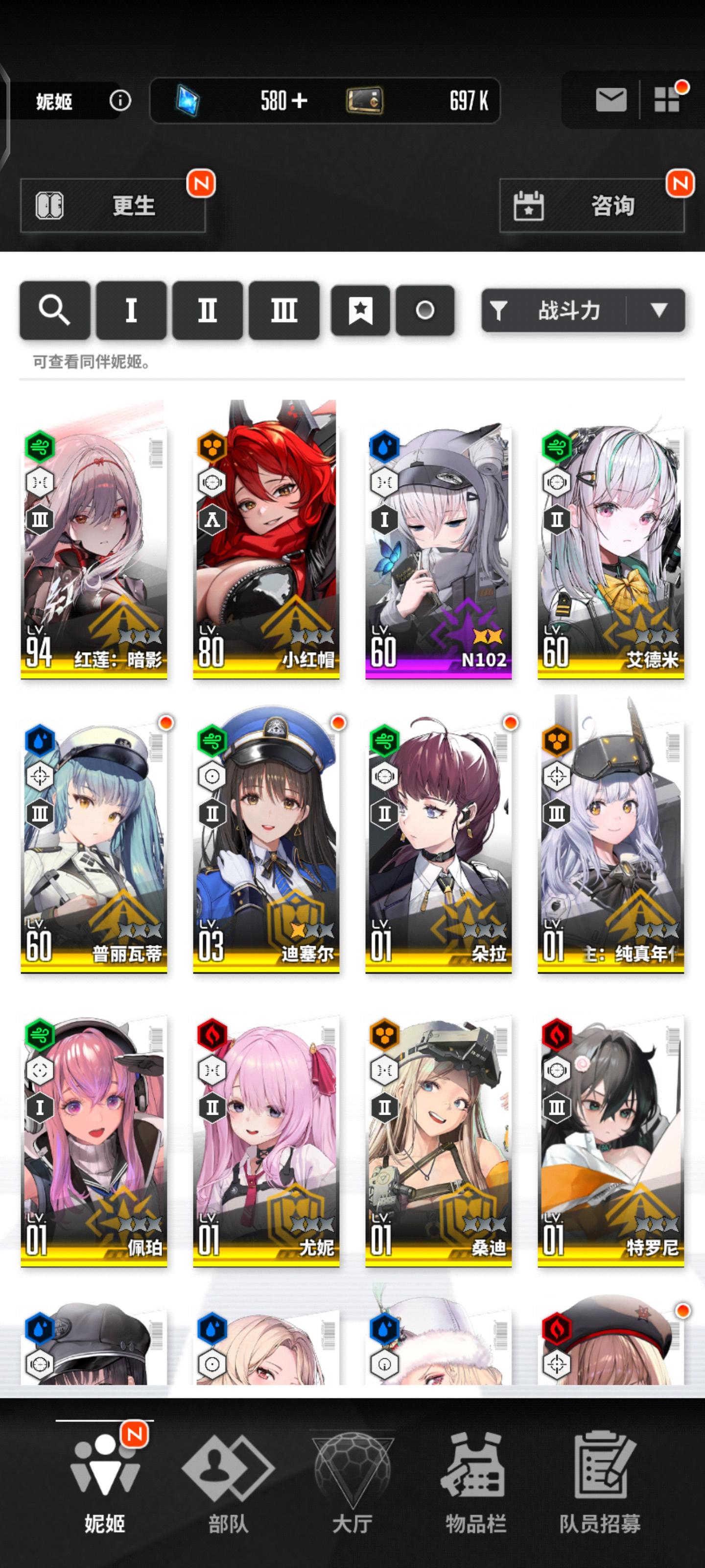 最近战力没什么长进,准备养二队了,马上盟突又要来了这三个队就将就用着了没法子,角色不多,也没资源养。