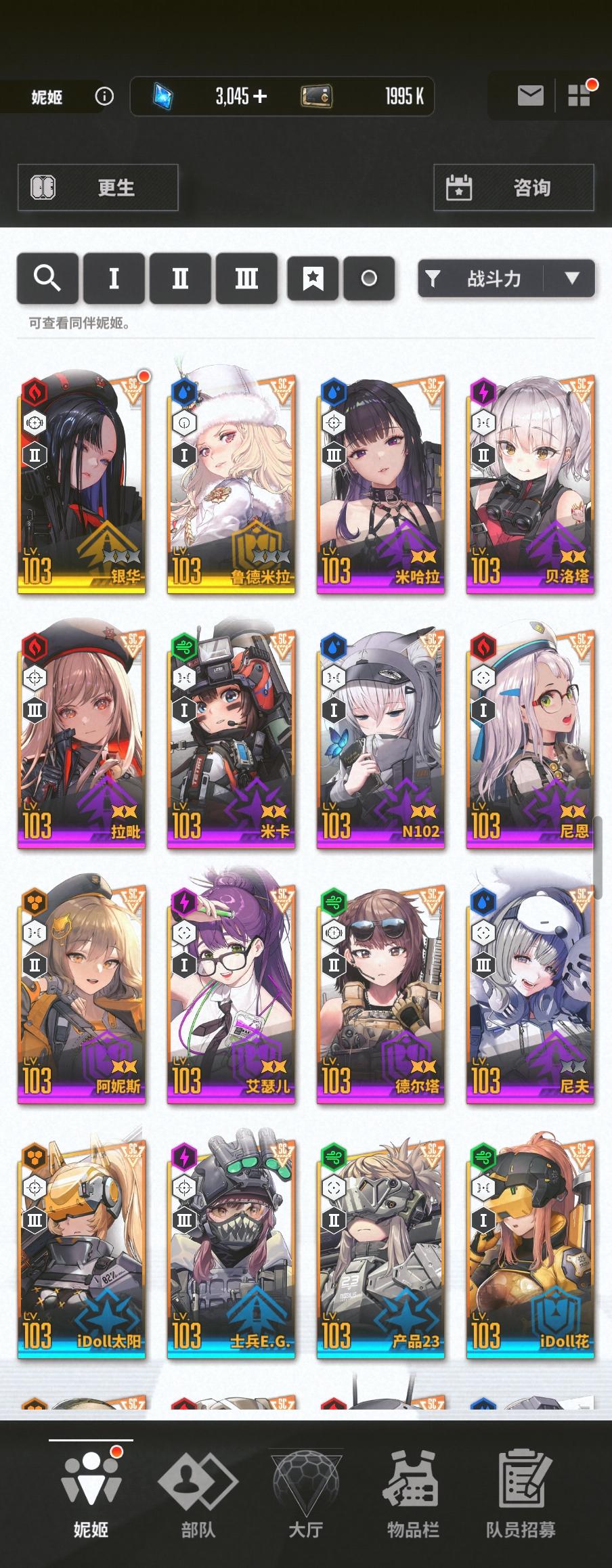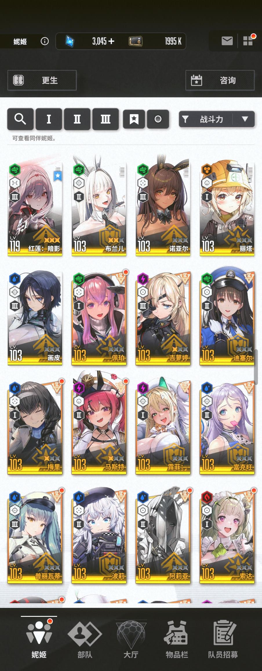 最近战力没什么长进,准备养二队了,马上盟突又要来了这三个队就将就用着了没法子,角色不多,也没资源养。