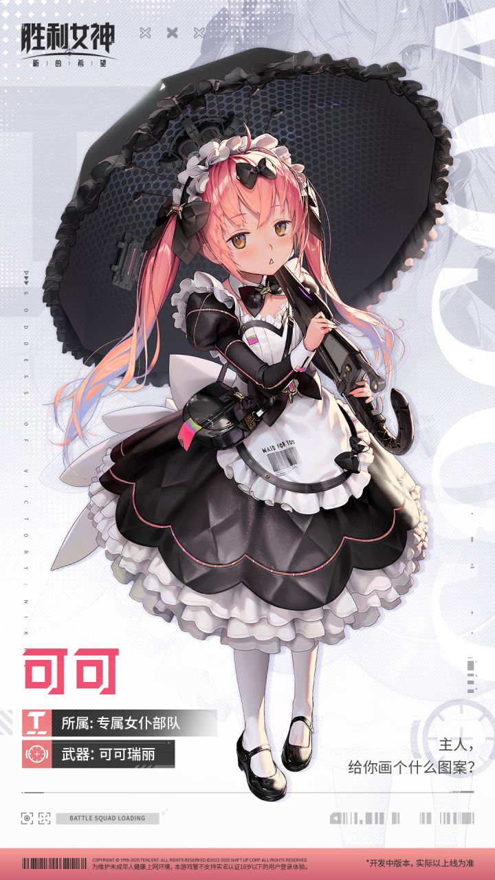 “主人,给你画个什么图案?”✦ 制造公司:泰特拉娱乐✦ 所属部队:专属女仆部队✦ 使用武器:狙击步枪-可可瑞丽✦ 定位:辅助型✦ 爆裂阶段:Ⅰ✦ 代码:燃烧专属女仆部队里受宠的老幺,同时也是女仆长。她带着自己对专业的独到理解,担任着女仆的工作。🎁 在评论区讨论新妮姬,我们将于1月5日于本条评论区随机抽取5位幸运指挥官,送出【随机妮姬立牌】1份!*数值为技能等级10级的数值*开
