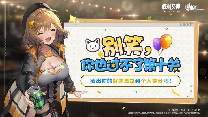 半周年答题挑战「别笑,你也过不了第十关!」正在进行中!谁才是真正的“妮游高手”?快来开启挑战,在评论区分享您的解题思路或者晒出印象最深的得分吧!你一定过得了第十关!🎁评论区分享解题思路或个人得分,我们将于12月10日抽取3位指挥官送出【66元现金】,再抽取5位指挥官送出【随机立牌】1份!▌活动入口:https://nikke.qq.com/cp/a20251021sqdt/index.ht