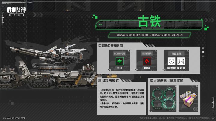 单人突击即将于12月11日12:00:00开启!派出多支队伍挑战BOSS战,可获得魔方强化材料、珍藏品以及收藏品保养材料等奖励。以累计伤害量决定挑战难度排名,各位指挥官能根据排名获得限定边框、珠宝等奖励。① 开启时间:2025年12月11日12:00:00 ~ 2025年12月17日23:59:59②本期BOSS信息- BOSS名称:古铁- BOSS代码:风压(弱点:燃烧代码)- 阵容推