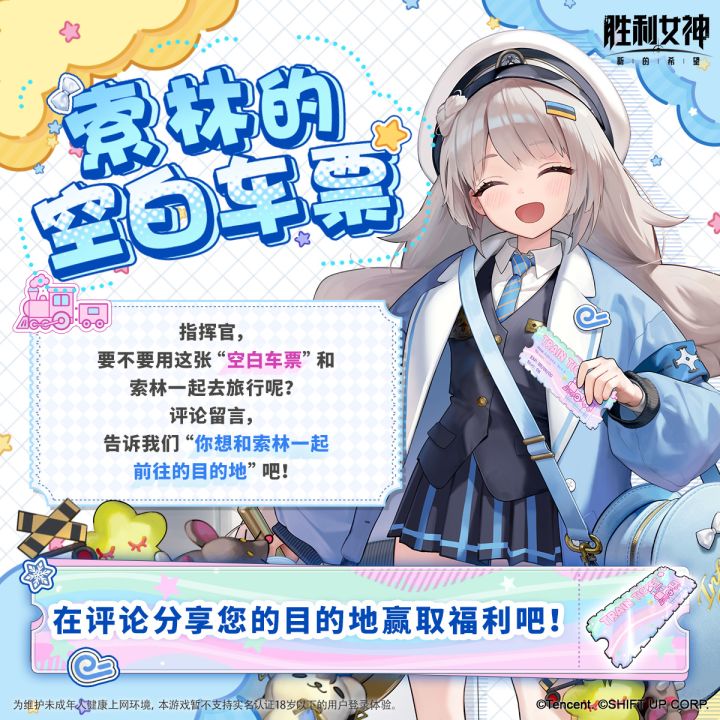 如果哪天……AZX可以去地面上的任何地方,指挥官要不要跟我一起去旅行?AZX是前往幸福的列车,指挥官的心中是否有想要前往的地方呢?🎁评论区留言你想去的目的地、或者在索林的空白车票上写下目的地并分享图片吧~我们将于12月16日于本条评论区随机抽取5位幸运指挥官,送出【随机立牌】1份!#胜利女神新的希望 #nikke