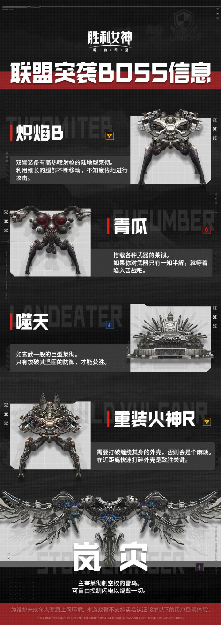 联盟突袭将在2025年12月5日4:00:00开放!排名规则优先顺序1 – 依照通关的日期顺序决定排名优先顺序2 - 通关日期相同时,将根据在纪录战达成的累计伤害决定排名。*参与条件:所在联盟等级达到1级各位指挥官依排名获得联盟芯片。联盟芯片可在联盟商店交换角色,魔方材料等物品。本次联盟突袭敌人名单:炽焰B[铁甲]双臂装备有高热喷射枪的陆地型莱彻。利用细长的腿部不断移动,不知疲倦