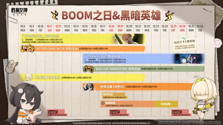《胜利女神:新的希望》全新活动「BOOM'S DAY BOOM之日」及「D.ARK HERO 黑暗英雄」分别将于10月8日、10月15日正式上线,活动更新内容与活动详情已全面收录,请指挥官查收本次活动日历!*活动内容详情以及开放时间请以游戏内公告为准。#胜利女神新的希望