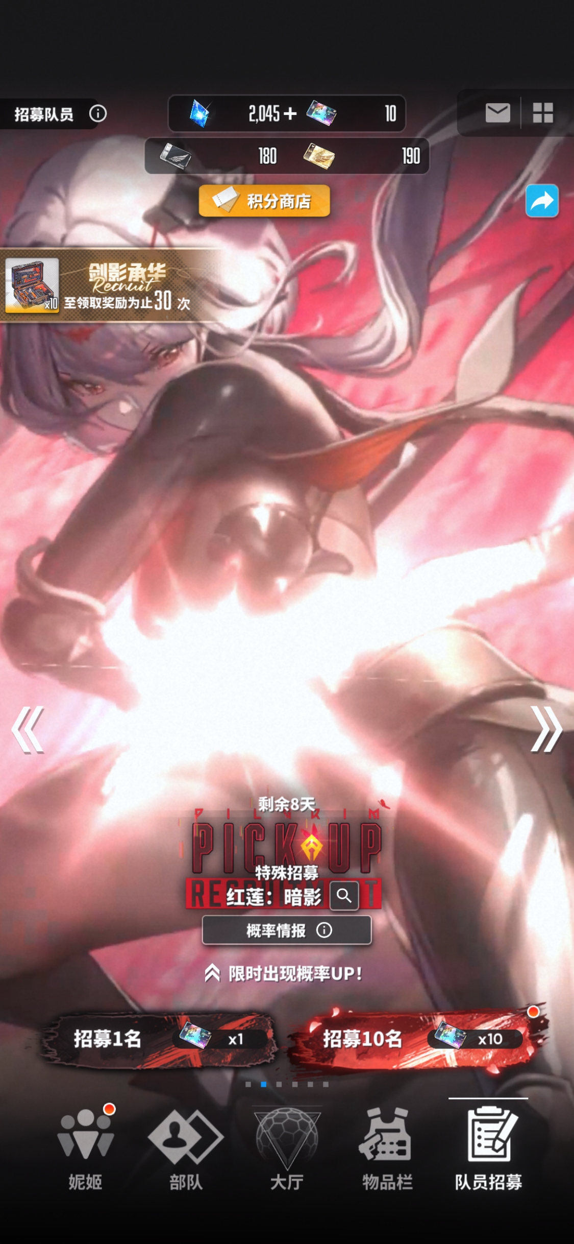 今天早上当赌狗了今天第三天的小号 本来想着只是把手上囤的60普票梭哈掉看能不能出小红帽 结果最后10抽点快了用掉了我的2400钻石加两张普票气死了然后我就准备破罐子破摔了直接剩下的钻石全梭哈黑莲池爽完不玩了结果谁能想到梭哈的第90抽出了小红帽结果就是黑莲池190抽7只黑莲1只红帽乐