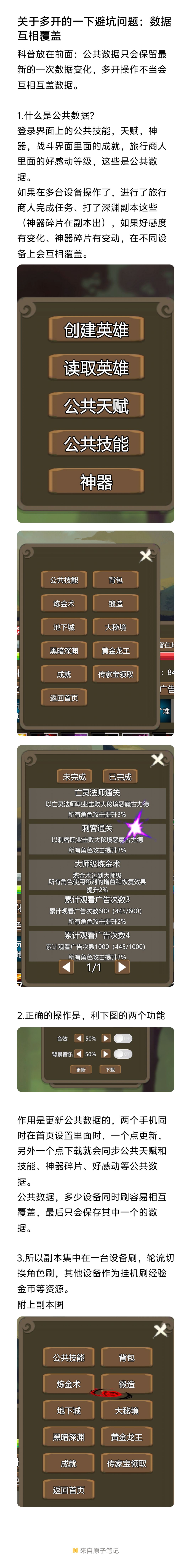 1.关于账号,可以进群转存档直接就有账号密码了。群号459299660 2.关于保存数据,游戏里的返回首页和首页的读取英雄都会自动保存角色数据,重点如果多开或者换手机的小伙伴,其他设备没有角色在挂机这个数据不会更新,所以很多小伙伴会出现其他设备数据没更新,点到读取英雄自动保存回档的情况,直接心态爆炸。最简单的解决办法,新设备清除游戏数据直接重新登陆账号就是最新数据。 3开局选啥天赋,选经验,经验多