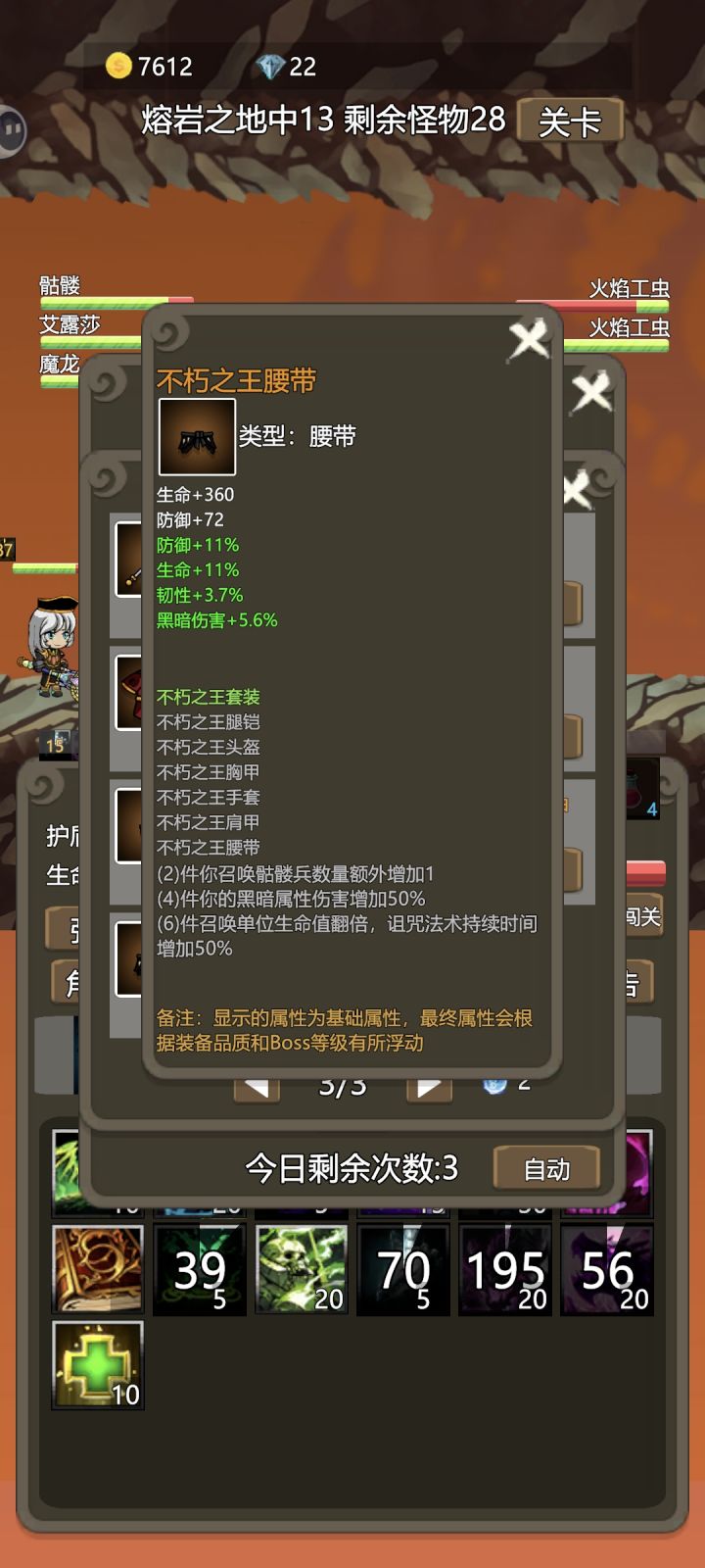 一、总览本帖着重分享个人心得和科普一些游戏的底层配置,大家一起学习,先说小学毕业的标准(我定的)①1200级转职②开局兑换码+签到+广告+掉落钻石升级到10级小骷髅召唤技能③不朽之王6件套如何做到?①选择骷髅,初始天赋选圣体②24小时挂机(尽可能)③有明确的成长方向(装备和等级上 主攻击 副生命 最后防御)④阵容明确,教会艾露莎捐款,获得治疗职业的佣兵艾露莎二楼说原因。#发