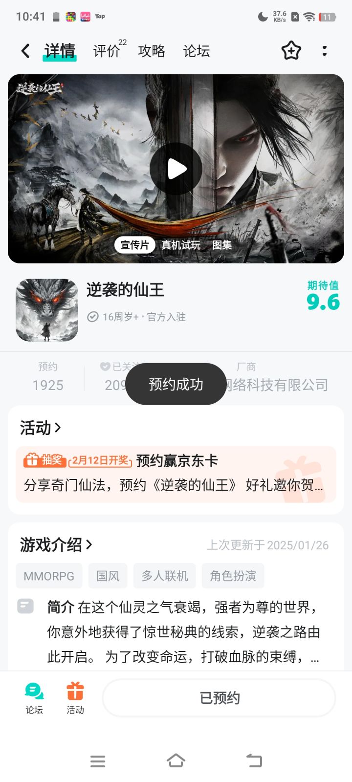 途浩渺,修仙之路波澜壮阔!唯有勇者才能突破命运的束缚,逆天改命。新春之际,与你一同书写属于我们的仙缘,开启一段全新的逆袭之旅!现在在评论区晒出你的预约截图,并介绍「你最想获得的仙法」,就有机会获得京东卡奖励!快来踏上修仙之路,逆天改命,问鼎仙王!活动规则【活动时间】2025年1月25日—2025年2月12日23:59【活动奖励】京东卡50元*1,共计抽取1人【参与方式】第一步:游戏