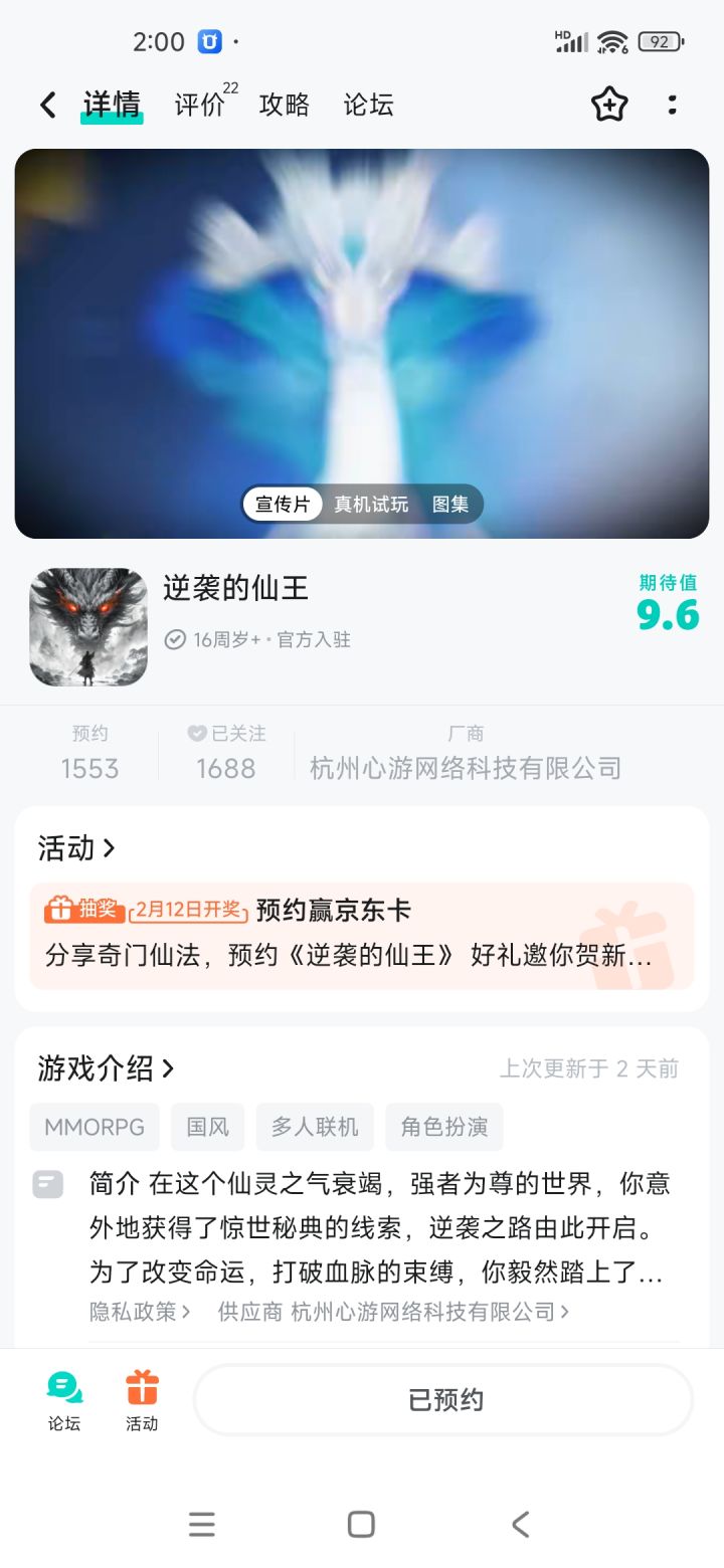 途浩渺,修仙之路波澜壮阔!唯有勇者才能突破命运的束缚,逆天改命。新春之际,与你一同书写属于我们的仙缘,开启一段全新的逆袭之旅!现在在评论区晒出你的预约截图,并介绍「你最想获得的仙法」,就有机会获得京东卡奖励!快来踏上修仙之路,逆天改命,问鼎仙王!活动规则【活动时间】2025年1月25日—2025年2月12日23:59【活动奖励】京东卡50元*1,共计抽取1人【参与方式】第一步:游戏