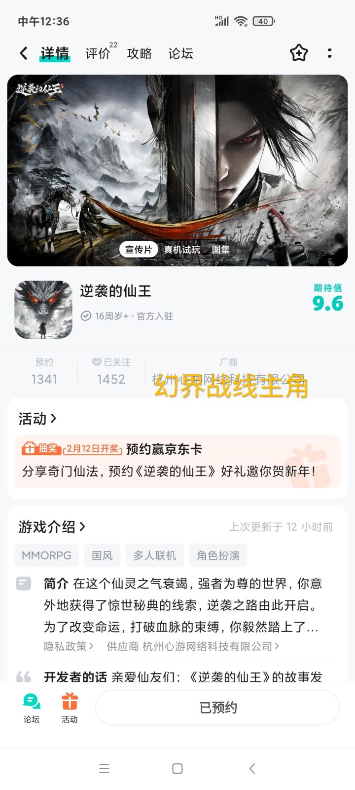 途浩渺,修仙之路波澜壮阔!唯有勇者才能突破命运的束缚,逆天改命。新春之际,与你一同书写属于我们的仙缘,开启一段全新的逆袭之旅!现在在评论区晒出你的预约截图,并介绍「你最想获得的仙法」,就有机会获得京东卡奖励!快来踏上修仙之路,逆天改命,问鼎仙王!活动规则【活动时间】2025年1月25日—2025年2月12日23:59【活动奖励】京东卡50元*1,共计抽取1人【参与方式】第一步:游戏