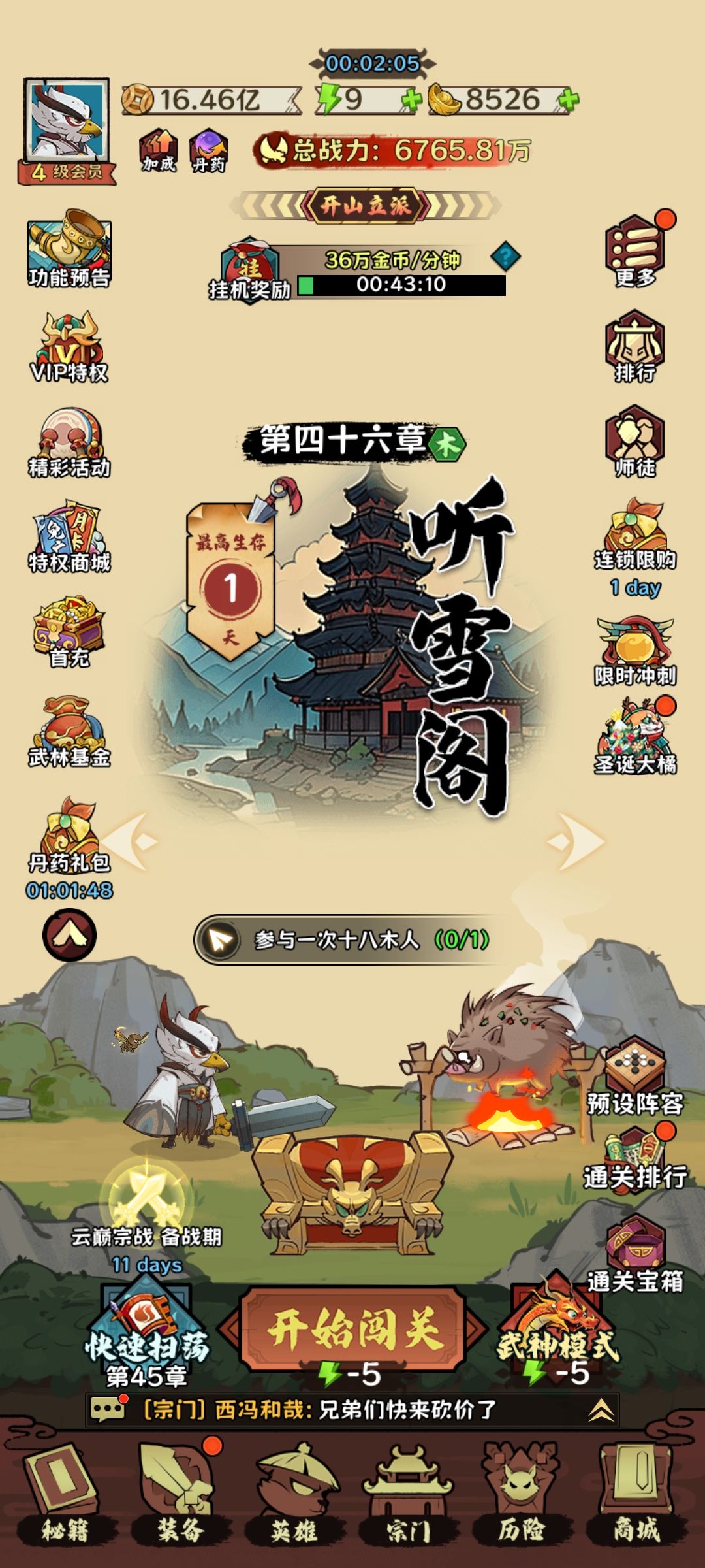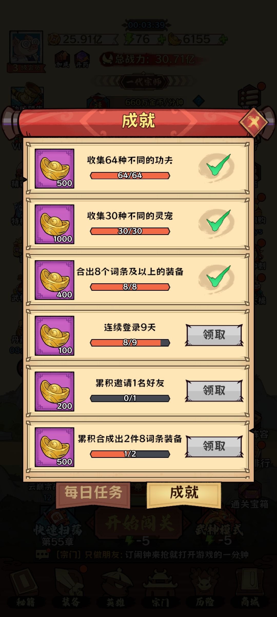 纯手动看广第六天晚上通55,第一天广告拉满体力,万能符,两次十连武功能打多少打多少然后拜师弄起来 闯关可以看广告拿双倍第二天有武功冲榜,拉满元宝上去拿满6羁绊腿法,搭乾坤大挪移明教羁绊和医术羁绊,只要被砍一刀不死就能反复横跳。这一套闯关无压力,拜师的可以多压39章以下,40章后就不能二次拜师浪费元宝很多,万能符不要去用,后续冲55刷装备要用很多!丹药也可以存,前期不急,差不多感觉时候到了全部丹药一