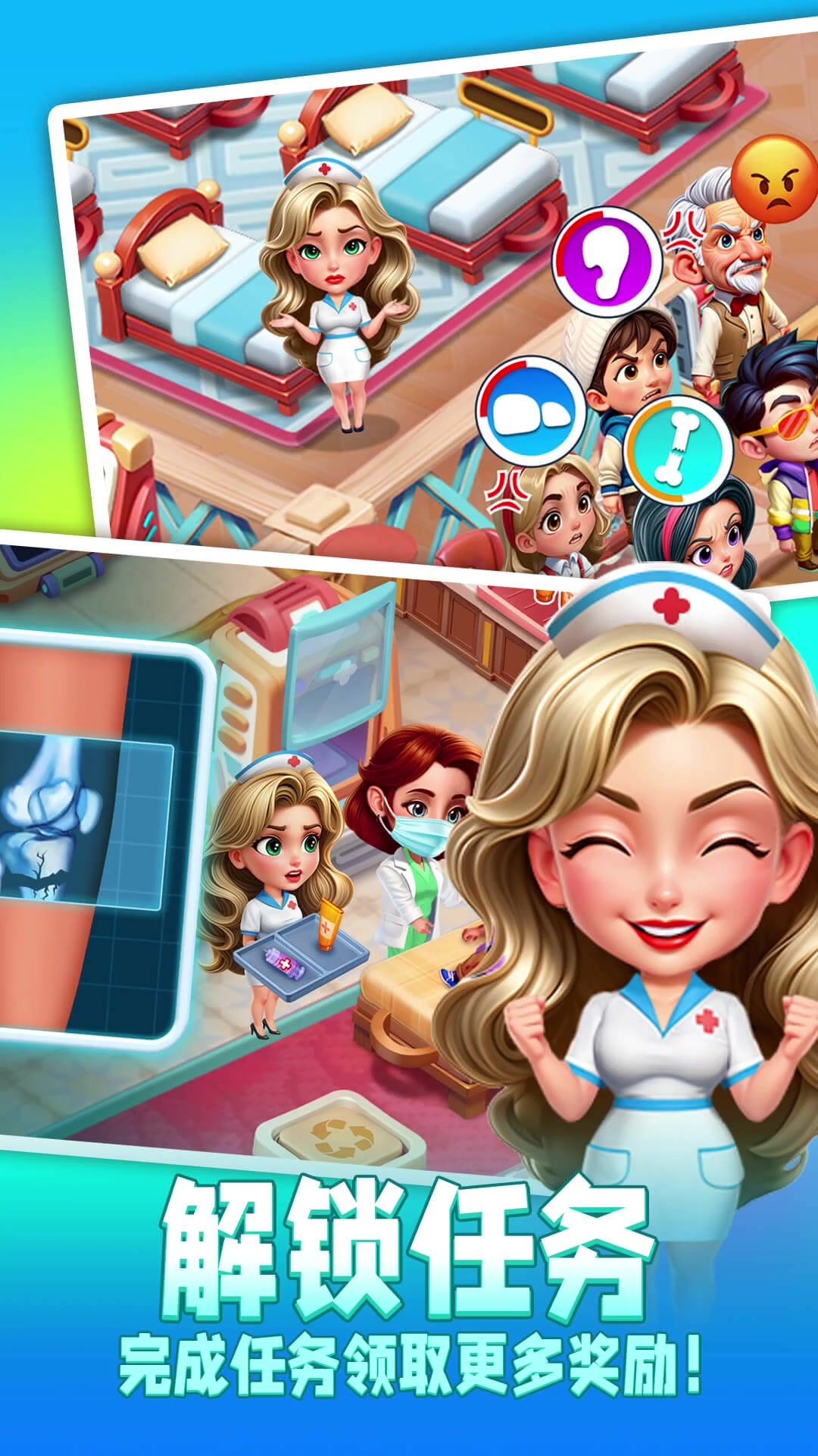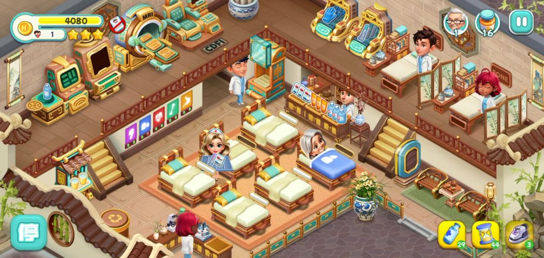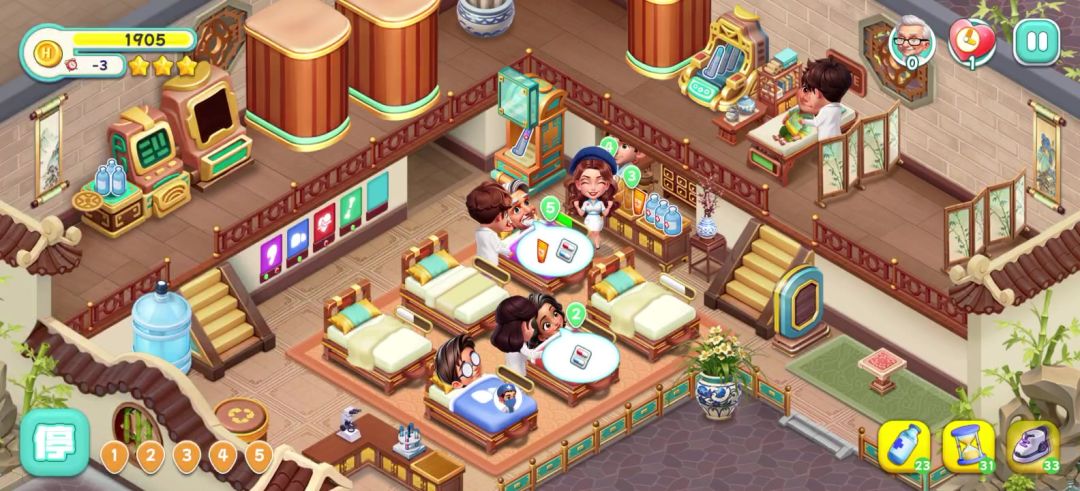 刚打完一关,就给我卡这样,点设置那边以后再回来就变成三十秒,有顾客进来但是护士只会在那跳,指令也完全没用😓