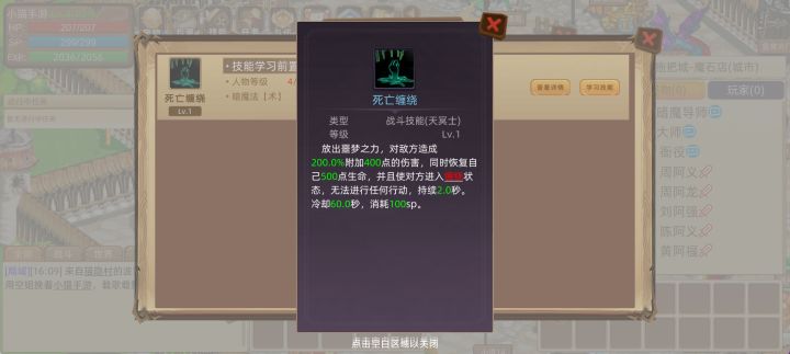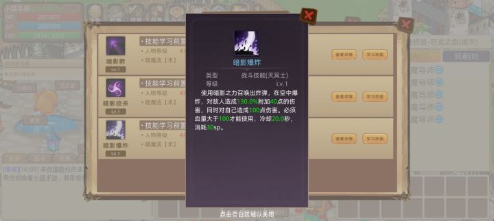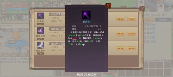 技能:【暗魔法】(术) 据说是冥界的魔法。能够汇聚宇宙间神秘的黑暗力量。HP提高X%。学习方法:法师等级达到10级,前往拖把城-巨龙之血接受转职任务。对应绝技:【暗影箭】 使用魔法放出黑暗之箭,对敌人造成X%附加X点的伤害,同时对敌人附加暗影状态,每秒受到X%的伤害,持续X秒。咏唱X秒,冷却X秒,消耗Xsp。【暗影爆炸】 使用暗影之力召唤出炸弹,在空中爆炸,对敌人造成X%附加X点的伤害,