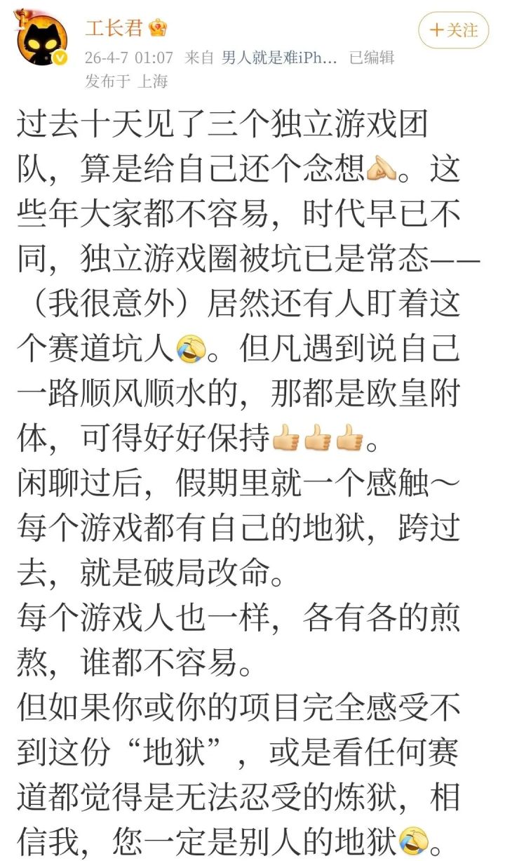 今日,网易仙侠单机《剑心雕龙》制作人工长君公开撰文,分享与独立游戏团队交流后的真实感悟,直言游戏行业生存艰难,从业者都在负重前行。工长君透露,近期十天内接连拜访了三支独立游戏团队,算是 “给自己还个念想”。他感慨如今行业环境早已不同,团队 “被坑” 已是常态,能一路顺风顺水的项目堪称 “欧皇附体”。他坦言,每款游戏都有各自要面对的困境,只有跨过重重难关才能破局;而每一位游戏人也都各有煎熬,在这个