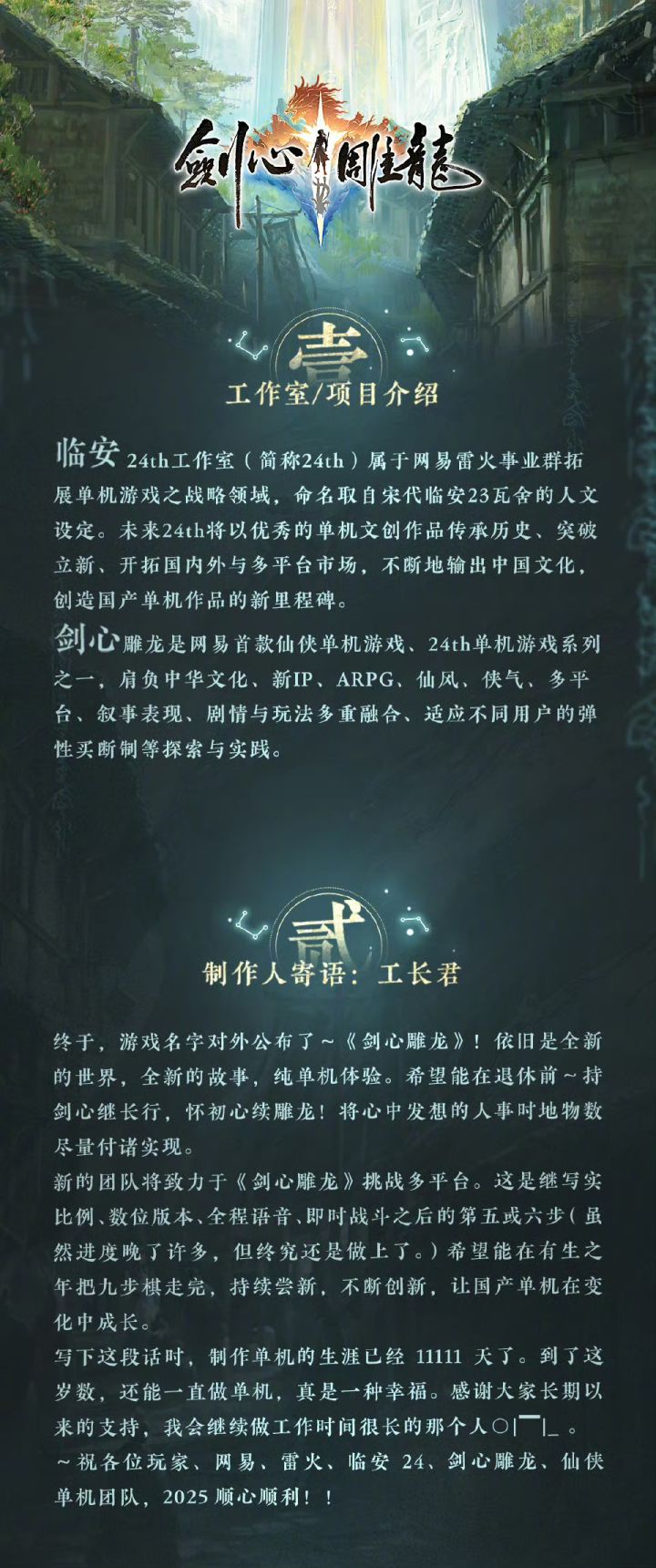 网易首款仙侠单机《剑心雕龙》制作人工长君近日发文回应玩家关切,谈及团队规模与开发进展。作为《古剑奇谭1/2》《仙剑奇侠传3/外传/4》的知名监制,他的动态始终牵动国产单机玩家的心。面对网友 “希望早点宣传” 的诉求,工长君直言项目一直以小团队模式推进,初期仅3人,目前仍处于缺人补招的状态。这也解释了游戏公布后宣传节奏较慢的原因。此前7月,他曾发布招聘微博,为项目招募PM/QPM岗位新人,明确要求
